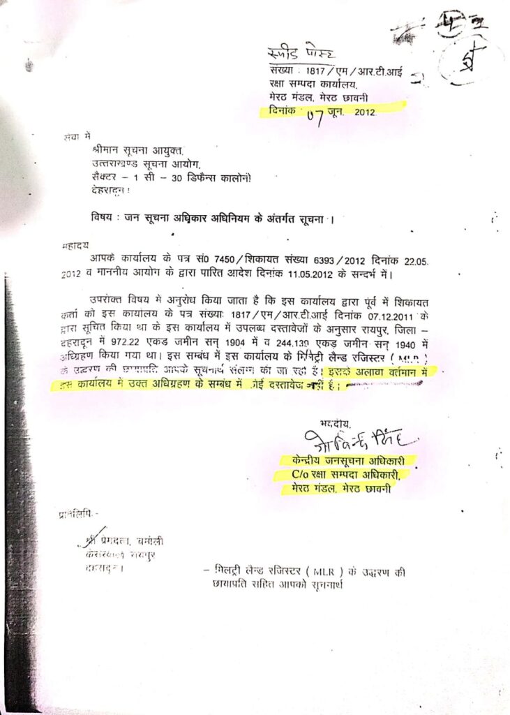 7 जून 2012 को रक्षा संपदा विभाग ने लिखित रूप में स्वीकार किया कि इन भूमि रिकॉर्ड्स से उनका कोई संबंध नहीं है।