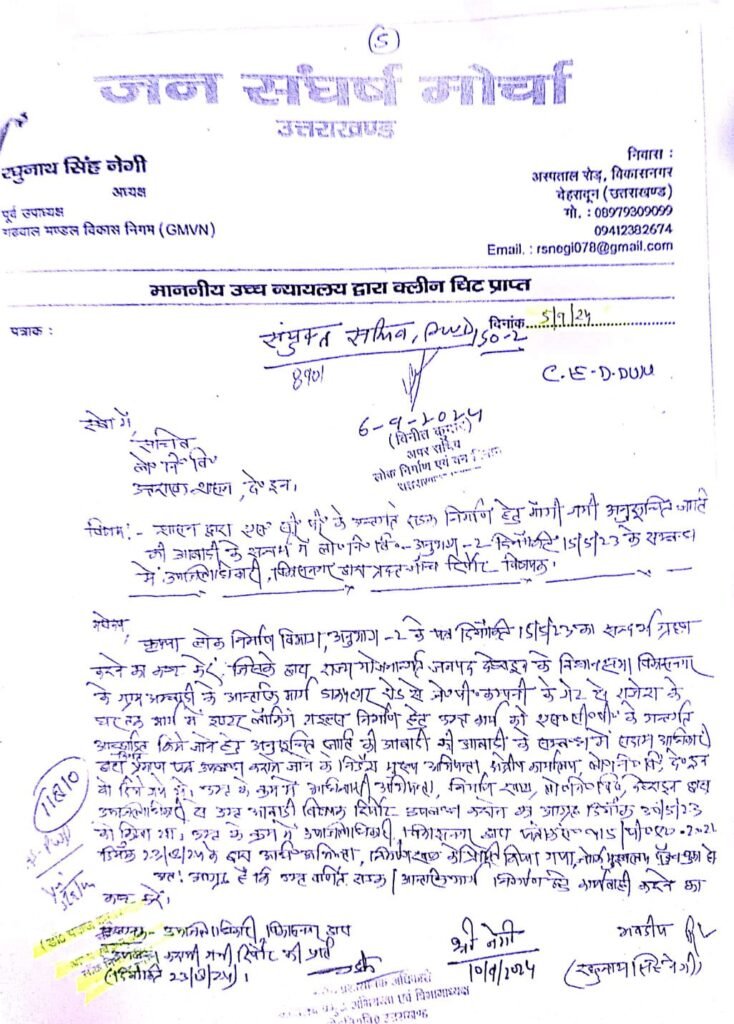 मोर्चा ने आरोप लगाया कि झूठा श्रेय लेने की जल्दबाजी में विकासनगर विधायक मुन्ना सिंह चौहान ने ग्रामीणों से अपना अभिनंदन भी करवा लिया, जबकि इस स्वीकृति में उनका कोई प्रत्यक्ष योगदान नहीं था।