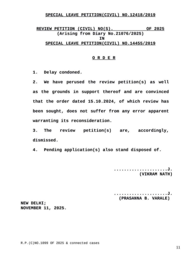 सुप्रीम कोर्ट ने 11 नवंबर 2025 को रिव्यू पिटिशन भी खारिज कर दी।